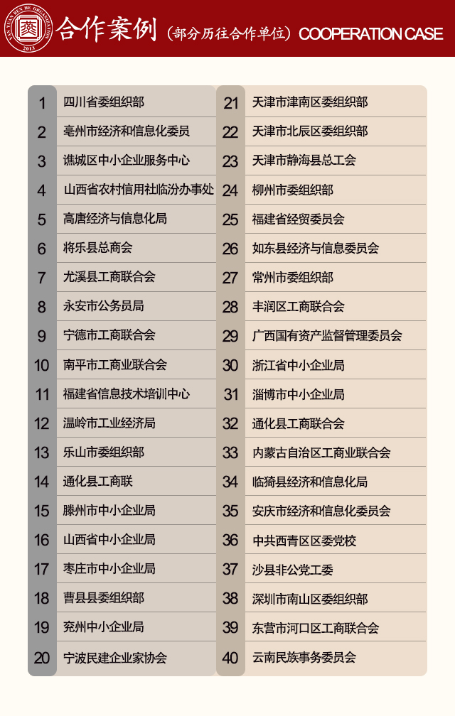 與山東淄博市中小企業(yè)局、各區(qū)縣組織部及婦聯(lián),先后舉辦了六期“山東企業(yè)總裁工商管理(淄博)研修班”、“山東高級管理人員工商管理(張店區(qū))研修班”、“山東高級管理人員工商管理(博山區(qū))研修班”、“山東高級管理人員工商管理(臨淄區(qū))研修班”、“山東高級管理人員工商管理(淄川區(qū))研修班”、“山東淄博印刷行業(yè)高層工商管理研修班”及“山東淄博魅力女性高級研修班”。